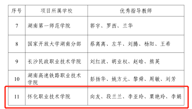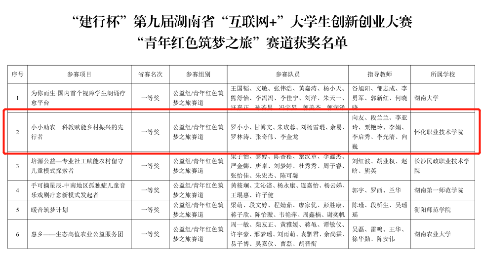 近日,湖南省教育厅公布了“建行杯”第九届湖南省“互联网+”大学生创新创业大赛获奖名单,我校共获金奖2项、银奖2项、铜奖2项,“优秀创新创业导师”10名,优秀组织奖2项。获奖数量、优秀创新创业导师数量创历史新高。