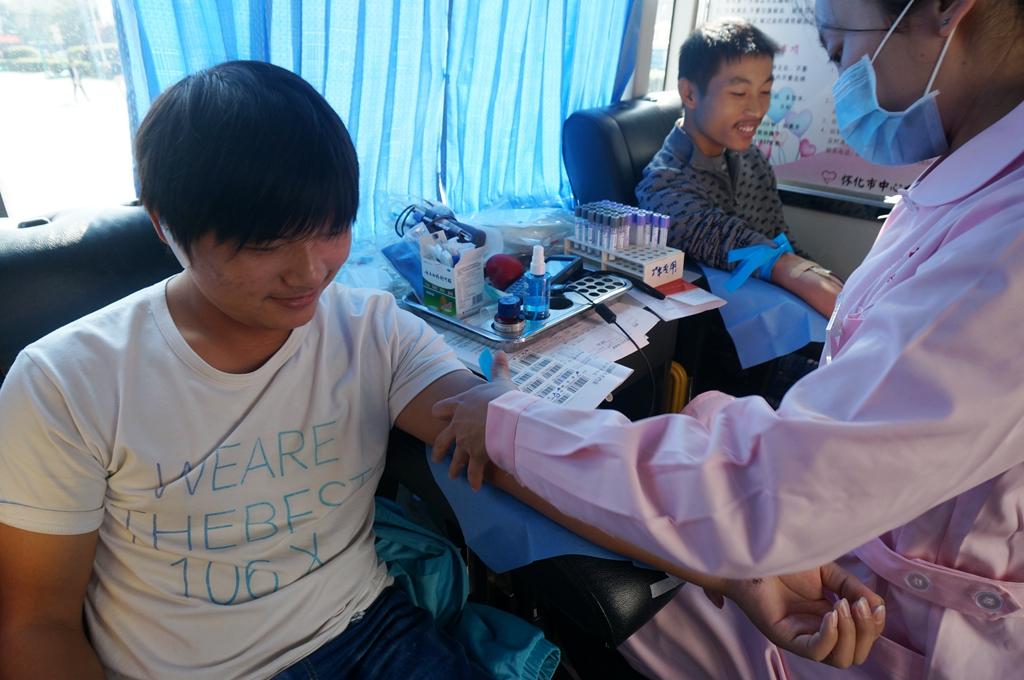 114日,我院学子本着奉献自己、关爱他人的高尚情操在学院篮球场举行了为期两天的无偿献血活动,院长王聪田、副院长罗向东等领导第一时间来到现场鼓励献血的师生。我院共有400多名教师和学生积极主动报名献血,最终252人符合献血条件并成功献血75600ML,为生命点燃了一份希望,为怀化市的献血工作做出了重要贡献。
